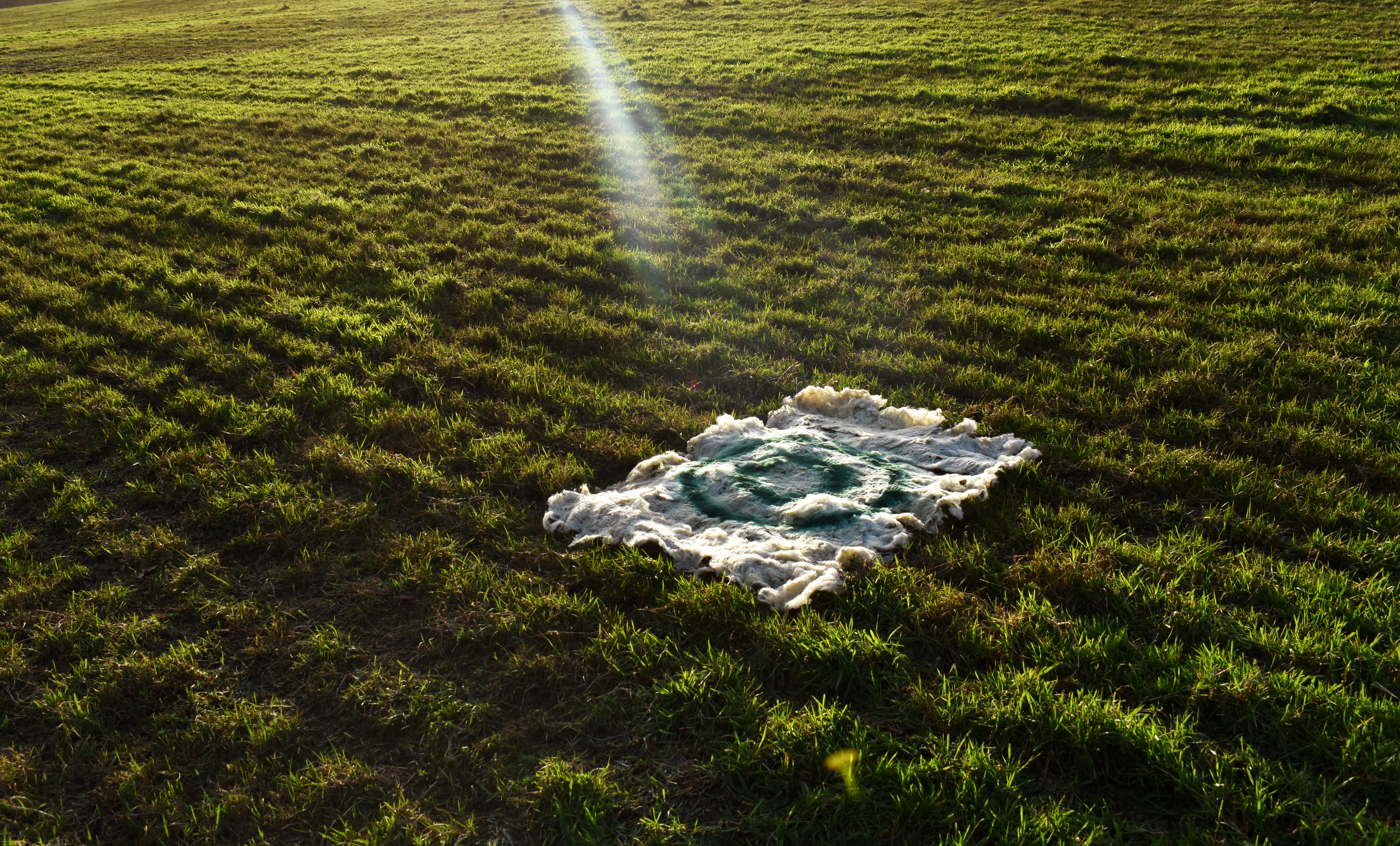 Hand-felted raw sheep fleece, smit marking paint, ploughed ground, 2022.